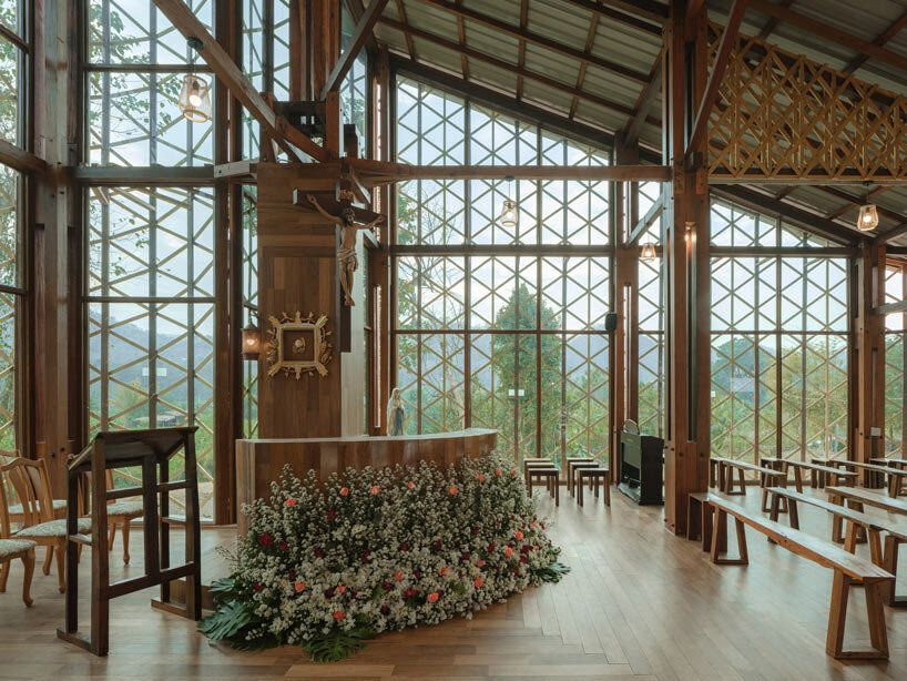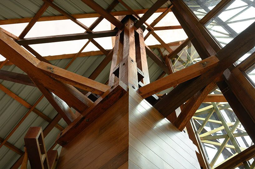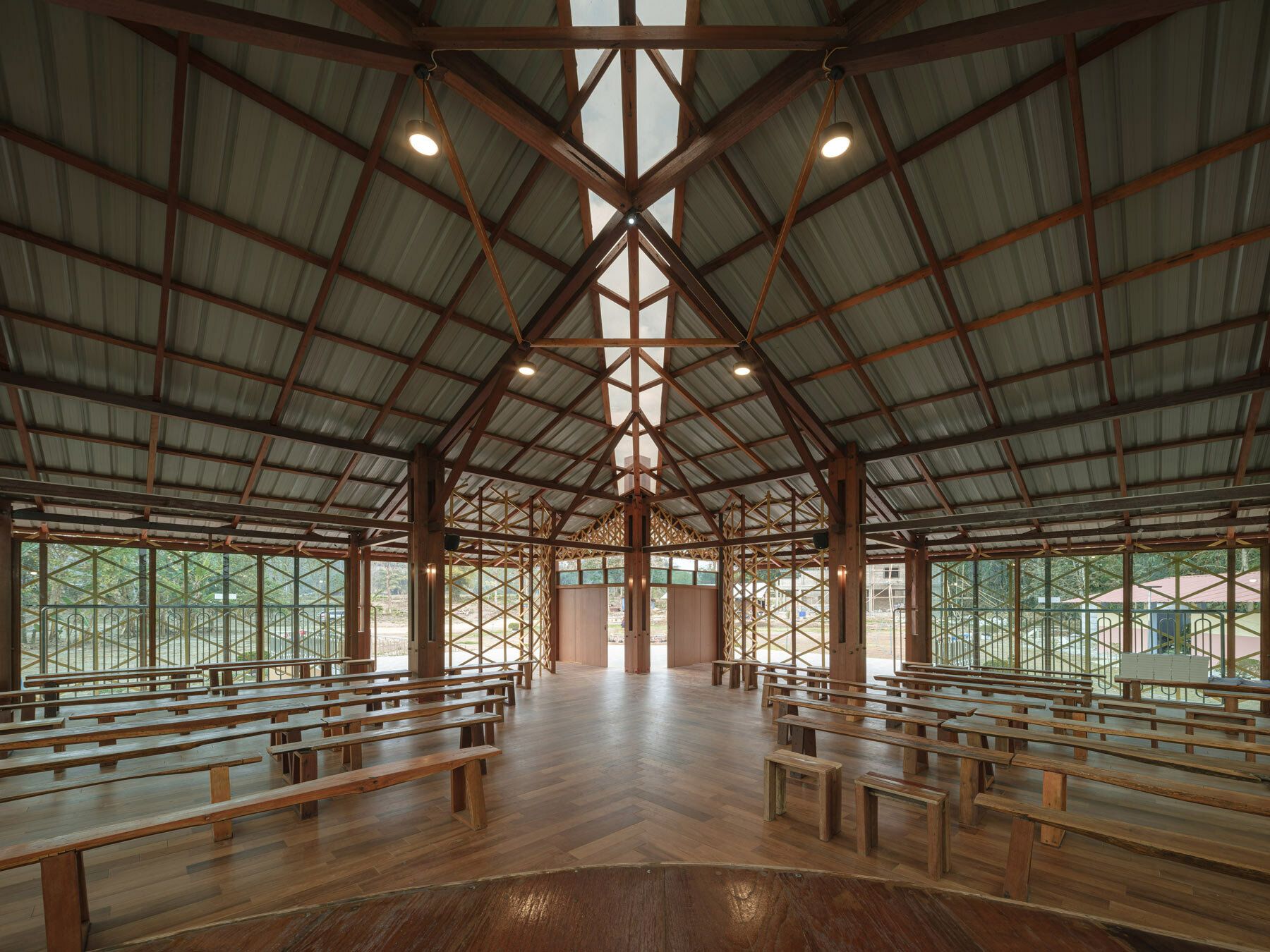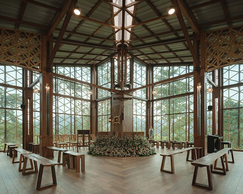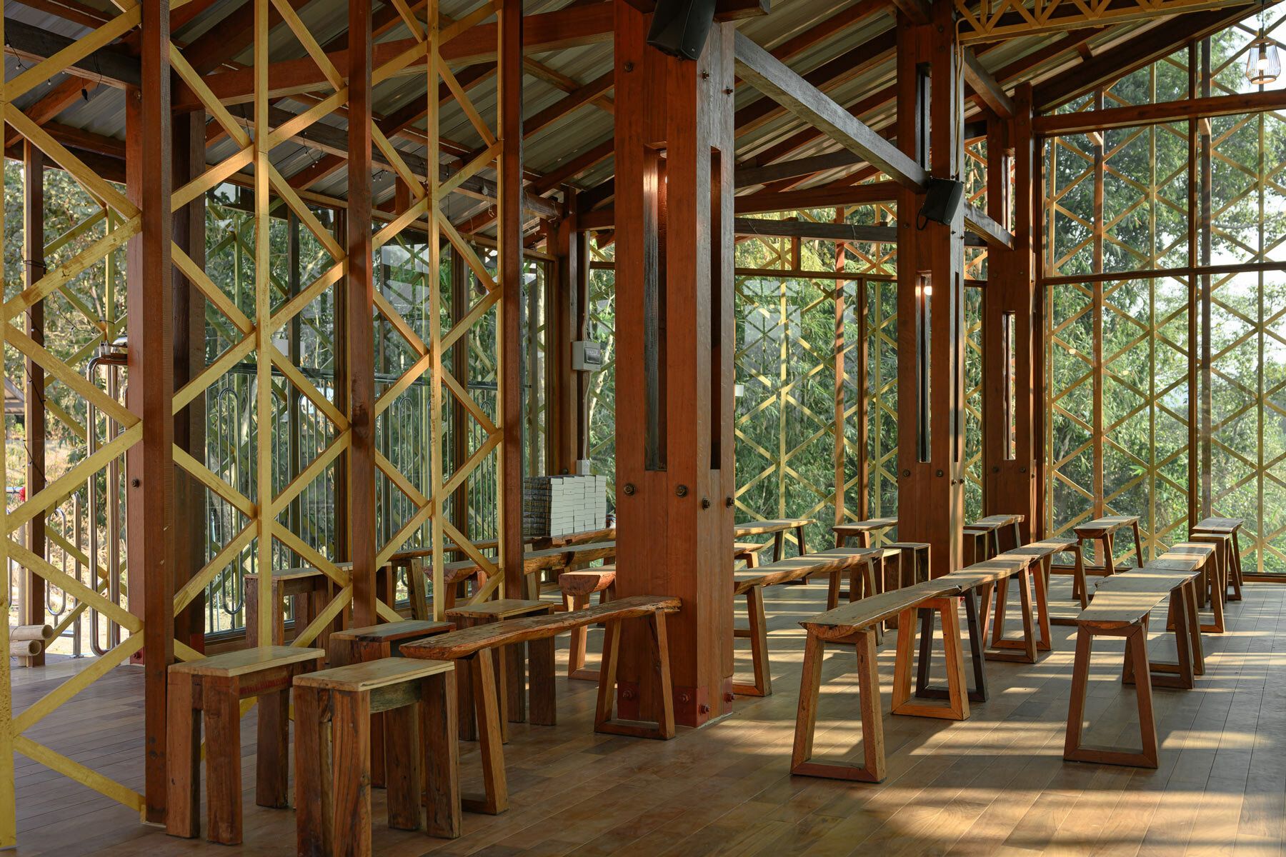 การใช้เสาโปร่งแบบคอมโพสิตสร้างความรู้สึกโปร่งสบาย ผสมผสานวัดกับป่าโดยรอบได้อย่างลงตัว เสาเหล่านี้ซึ่งวางอยู่ตามแนวเส้นรอบวงด้านนอก ทำหน้าที่เป็นช่องทางระบายอากาศแบบพาสซีฟ ทำให้ลมในหุบเขาพัดผ่านวัดได้