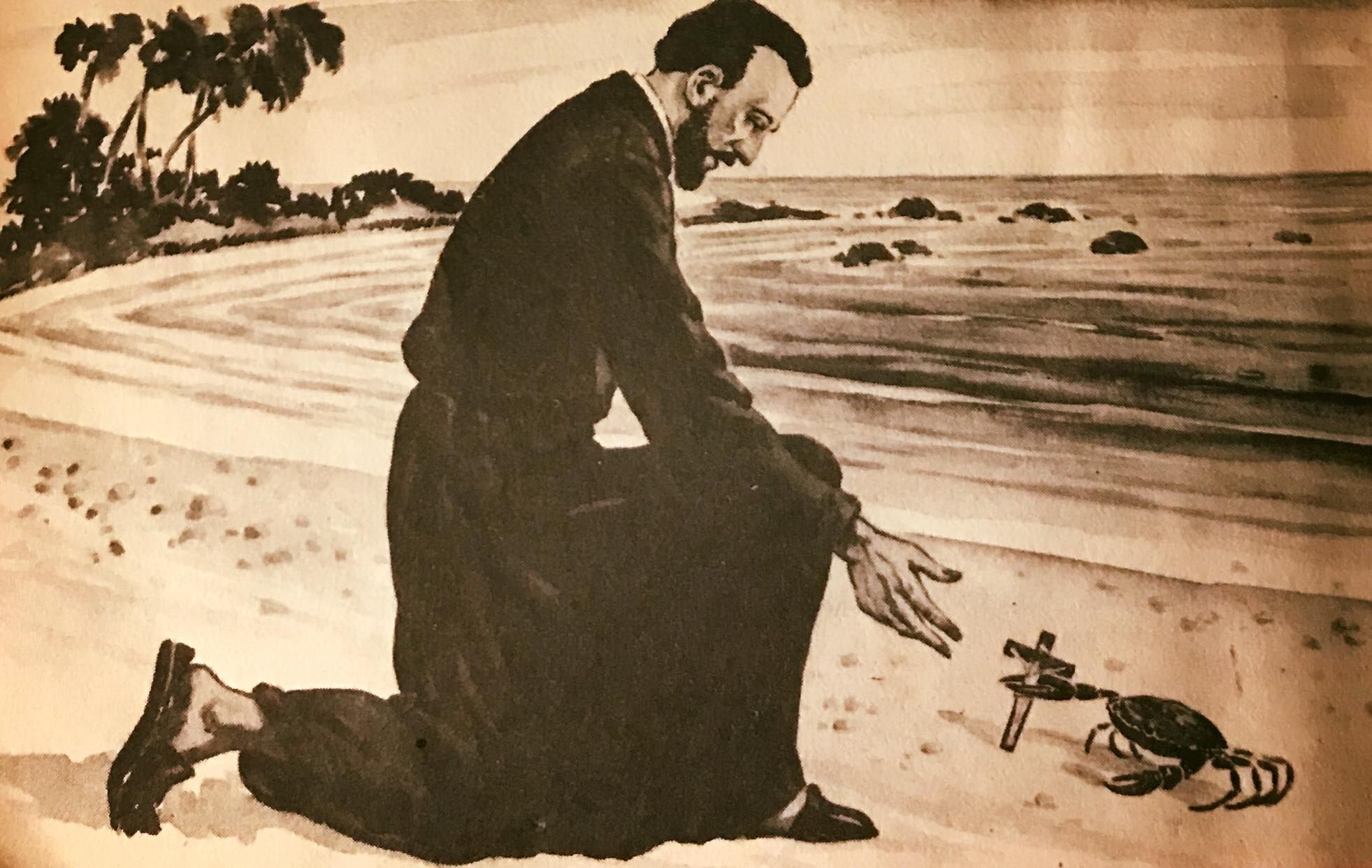 พายสงบลงในทันทีแต่ไม้กางเขนนั้นก็หลุดมือท่านและจมหายไปในทะเล  ท่านภาวนาวิงวอนต่อพระเจ้าเพื่อที่จะได้มันกลับมา ต่อมาเมื่อท่านมาถึงชายฝั่งของแหลมมลายูได้อย่างปลอดภัยแล้ว ท่านก็ได้แลเห็นปูตัวหนึ่งกำลังเดินอยู่บนชายหาดและที่ก้ามของมันนั้นก็ปรากฏกางเขนของท่าน  ปูเดินมาถึงท่าน ซึ่งท่านก็ได้คุกเข่าลงและก้มไปหามัน มันหยุดต่อหน้าท่านและและวางกางเขนไว้ ก่อนทุ่งหน้ากลับทะเลเช่นเดิม ท่านคุกเข่าลงและเอาไม้กางเขนคืนด้วยก่อนอวยพรให้มันละฉับพลันกางเขนก็ปรากฏขึ้นบนกระดองของปูตัวนั้น  ก่อนภาวนาขอบพระคุณพระเจ้าสำหรับกางเขนได้คืนมานี้ ในปัจจุบันปูที่มีกางเขนที่กระดองมันนี้ยังสามรถพบได้อยู่ จนถึงทุกวันนี้ ตำนานนี้เป็นที่มาที่ไปของการออกแบบวัดแห่งนี้